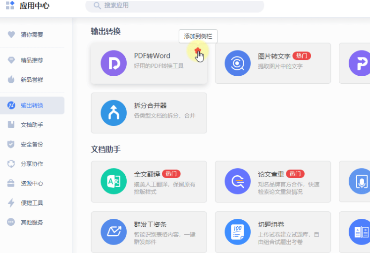 在展开的列表中找到您需要固定的应用(如“PDF转Word”)。将鼠标悬停在该应用上,其右侧会出现一个“图钉”形状的图标。